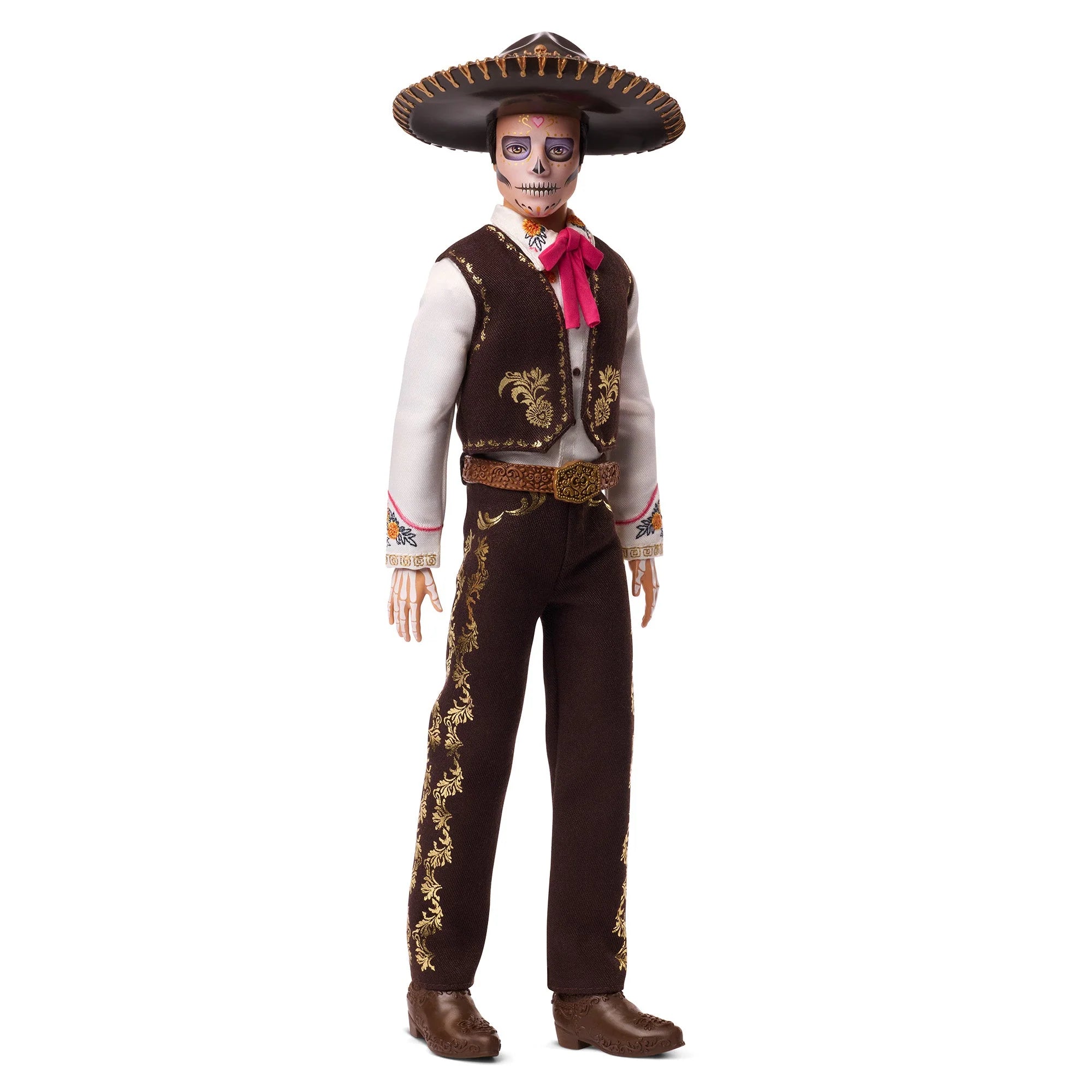 Celebrate tradition and style with the Día de Muertos Ken 2025 Collector Edition Doll — a tribute to heritage, remembrance and artistry. This special-edition Ken is dressed in a Jalisco-style charro outfit: tailored vest and trousers with gold-accent embroidery, a cream shirt with marigold (cempasúchil) floral details on the cuffs and collar, and a matching sombrero with skull-motif stitching. His face features classic calavera (sugar-skull) makeup and sculpted skeleton-bone details on his hands — adding a respectful nod to the festival’s roots.